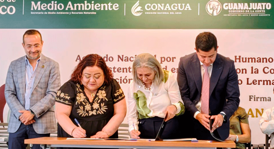 El convenio se firmó este miércoles en la ciudad de León por parte de Giovanni Melgar Hernández, subdirector General Jurídico de la Comisión Nacional del Agua (Conagua); de María de Lourdes Medina Ortega, presidenta nacional de la Cámara Nacional de la Industria de Transformación (Canacintra); y de Claudia Gómez Godoy, comisionada del Proyecto de Restauración del Río Lerma-Santiago.